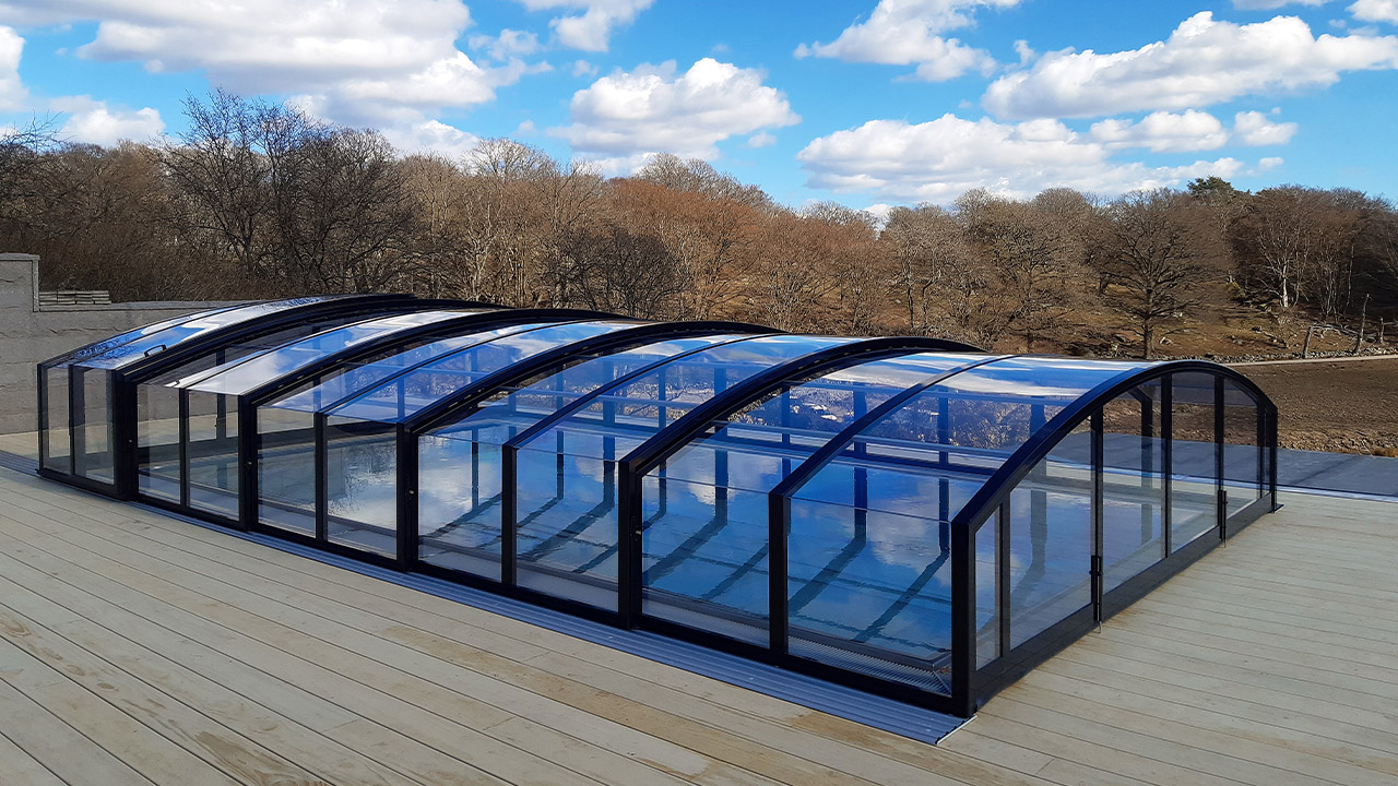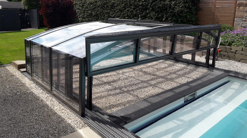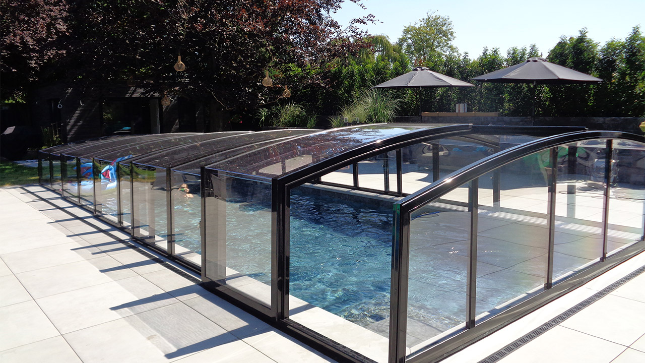Cet abri de piscine est particulièrement adapté aux bords de piscine surélevés et aux coffres de volets roulants.