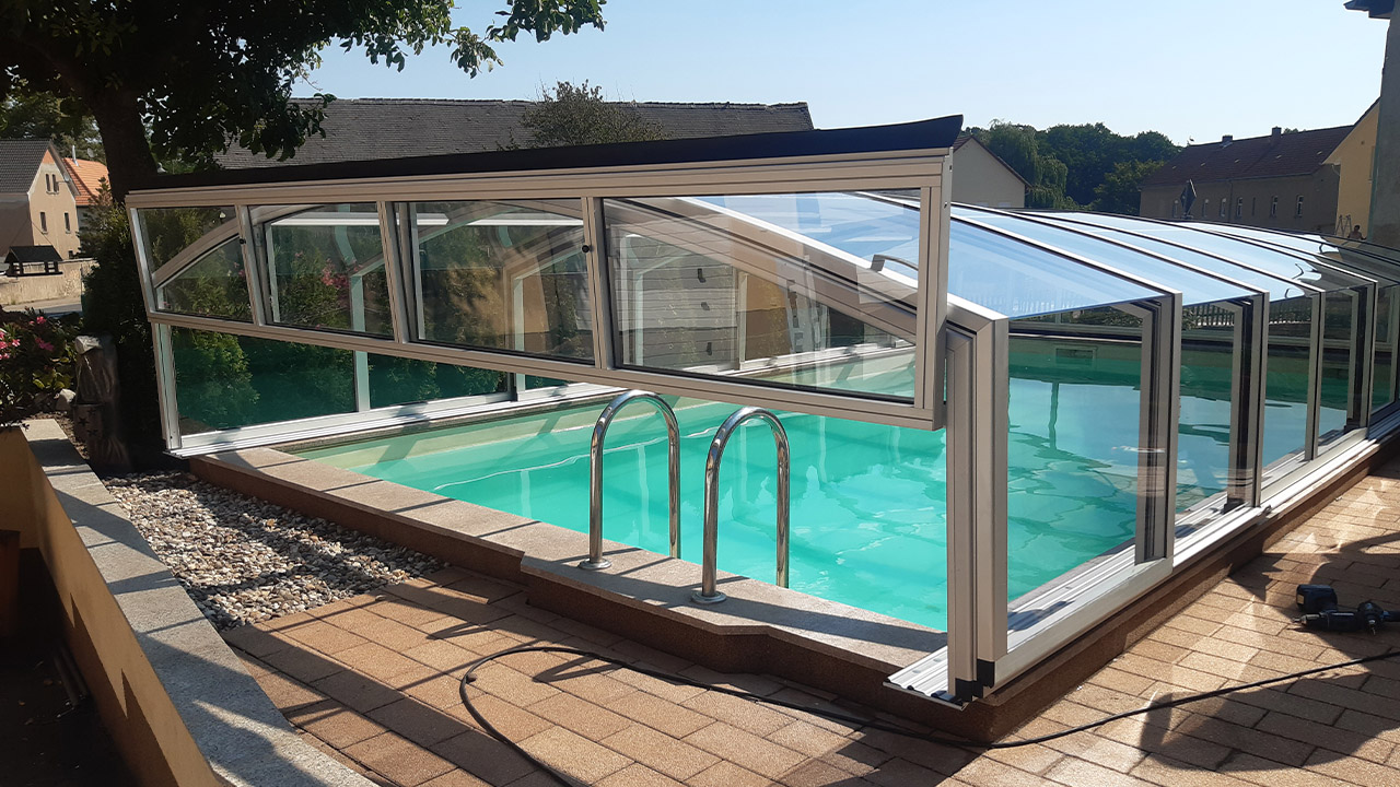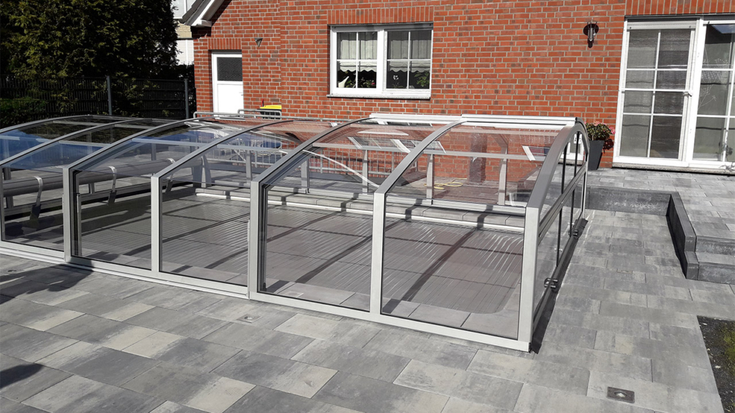 Le toit de la piscine offre une protection contre les accidents pour les enfants et les animaux domestiques. La protection contre le vent spécialement conçue ainsi que des panneaux massifs de haute qualité protègent du vent et de la neige. Le vitrage en polycarbonate est absolument incassable et résistant aux chocs.