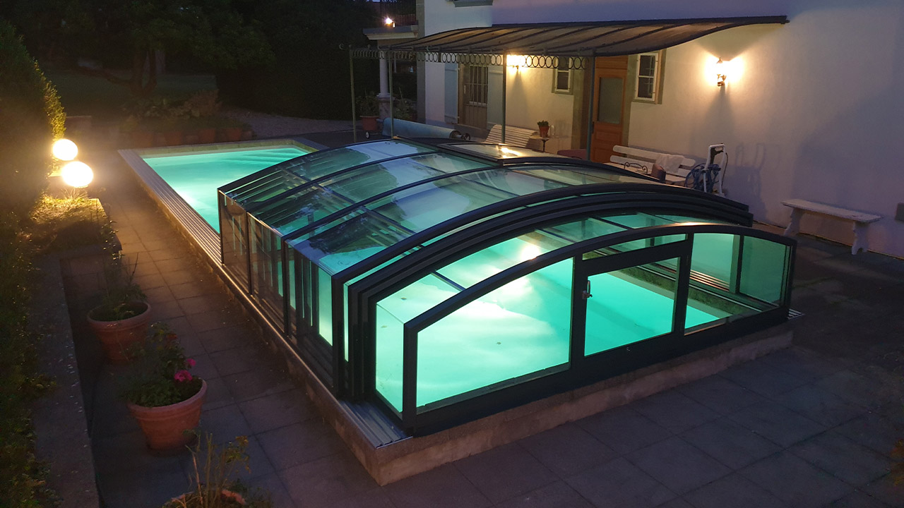 Le design de l’abri CARAT a été conçu pour ceux qui aiment les formes angulaires. L’abri CARAT se caractérise par sa modernité et sa construction unique avec des coins transparents. La conception verticale des parois latérales de cette couverture de piscine offre beaucoup d’espace vers le haut et permet d’intégrer toutes les surélévations. Le déplacement se fait facilement et rapidement par une seule personne. Une motorisation est disponible en option. Avec un abri de piscine, vous réduisez non seulement les pertes d’eau par évaporation, mais aussi vos efforts de nettoyage.