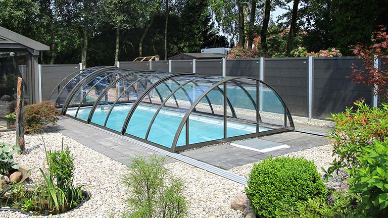 La vue sur l’environnement habituel de votre jardin est à peine entravée, car la construction compacte et basse de l’abri de piscine s’intègre parfaitement dans l’environnement. La construction de l’abri de piscine ESPRIT est extrêmement robuste et répond aux exigences les plus élevées. Sa forme régulièrement cintrée assure un ensoleillement maximal à tout moment et conduit la chaleur à l’intérieur de l’abri de piscine.