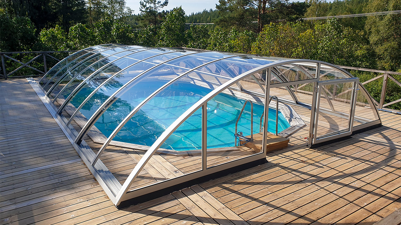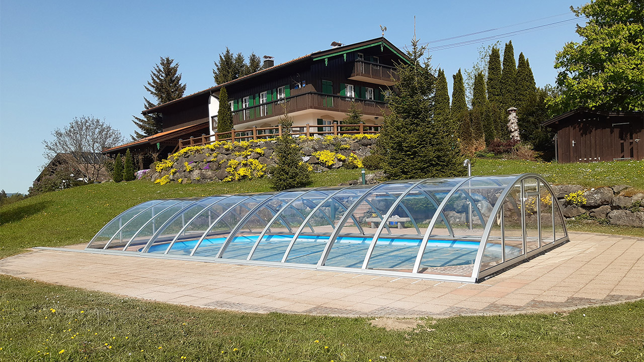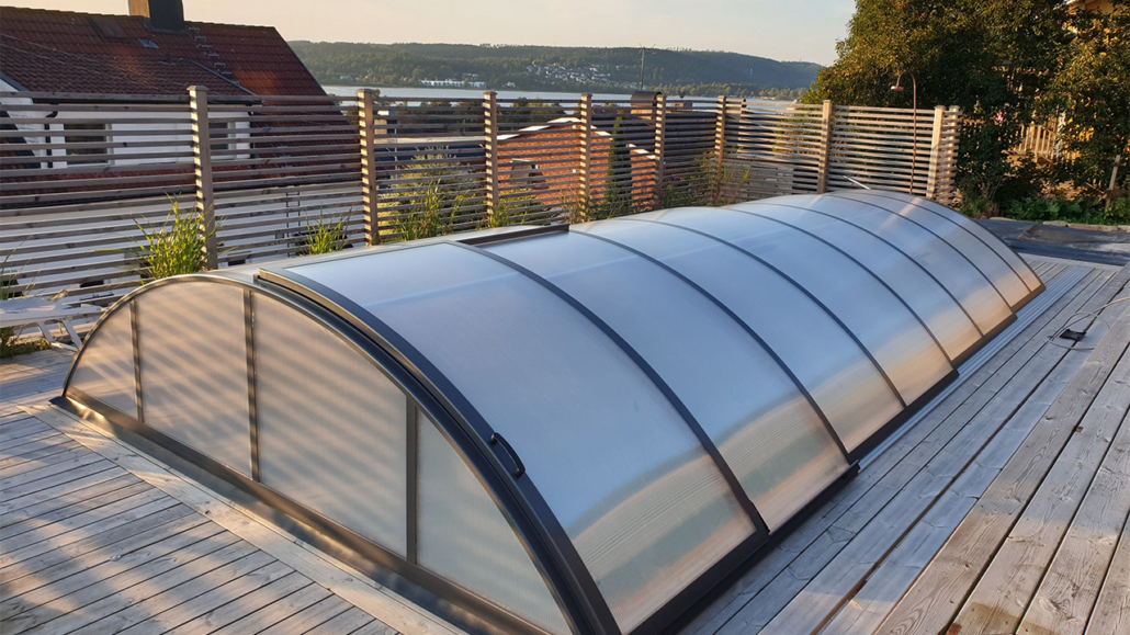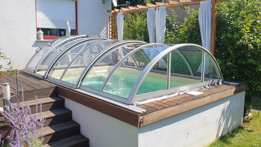 Le toit de la piscine offre une protection contre les accidents pour les enfants et les animaux domestiques. La protection contre le vent spécialement conçue ainsi que des panneaux massifs de haute qualité protègent du vent et de la neige. Le vitrage en polycarbonate est absolument incassable et résistant aux chocs.