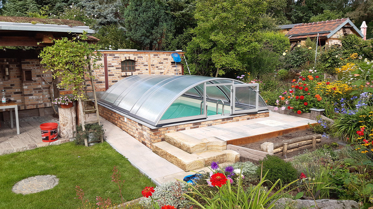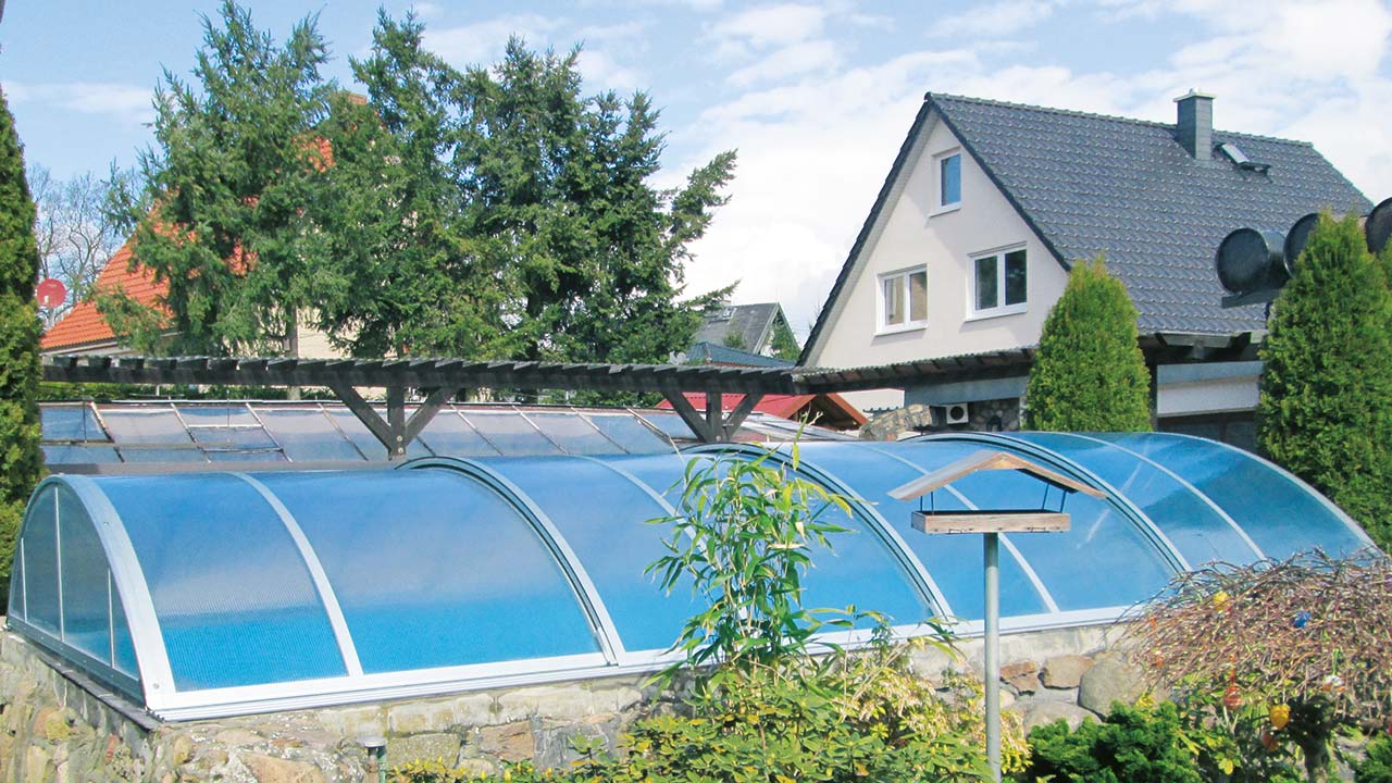 La couverture de piscine offre une protection contre les accidents pour les enfants et les animaux domestiques. Le système de protection contre le vent spécialement développé et les panneaux massifs de haute qualité protègent contre le vent et la neige. Le vitrage en polycarbonate est absolument incassable et résistant aux chocs.