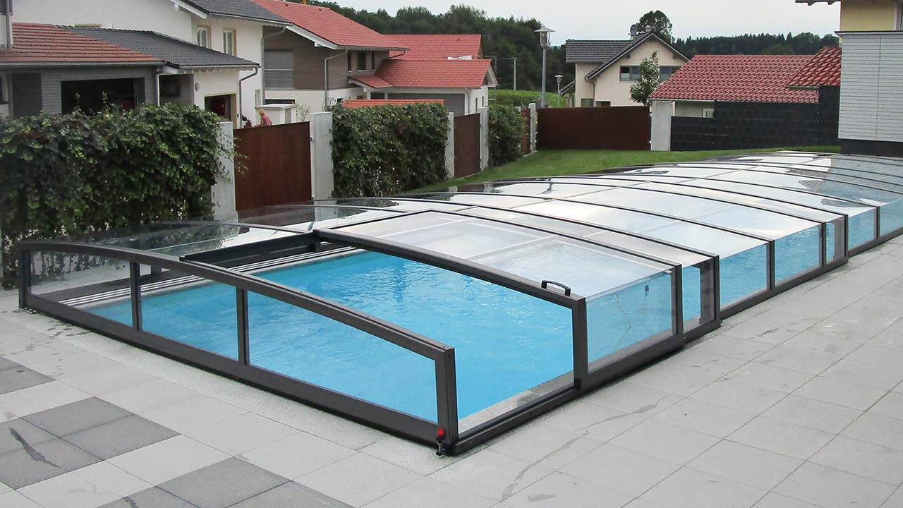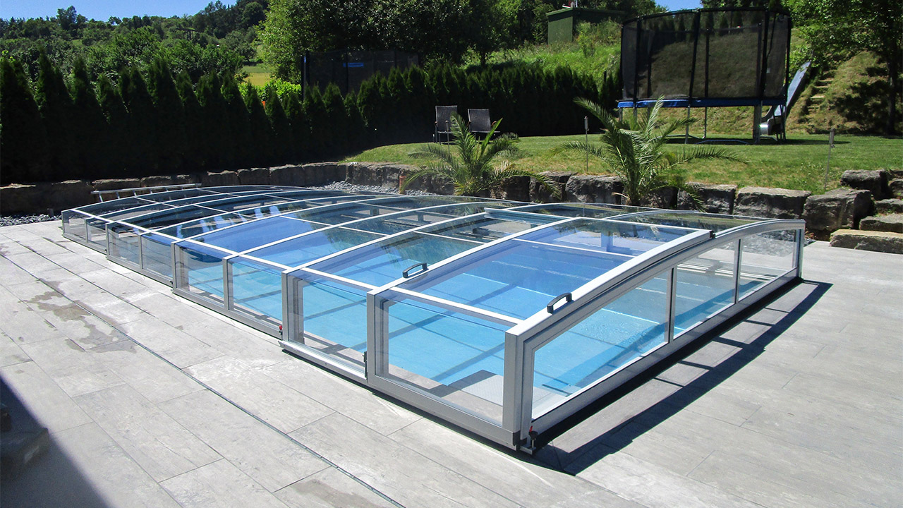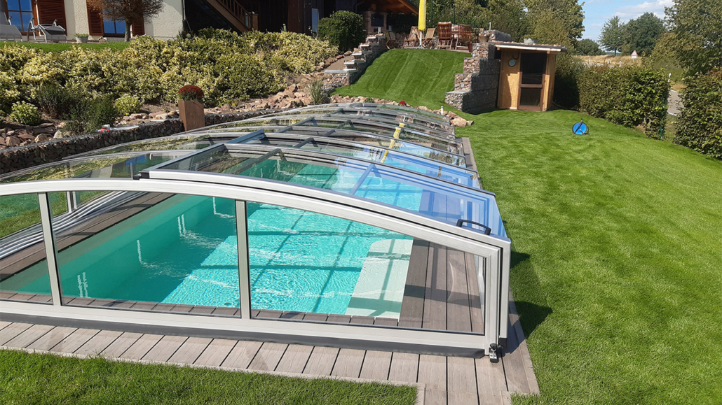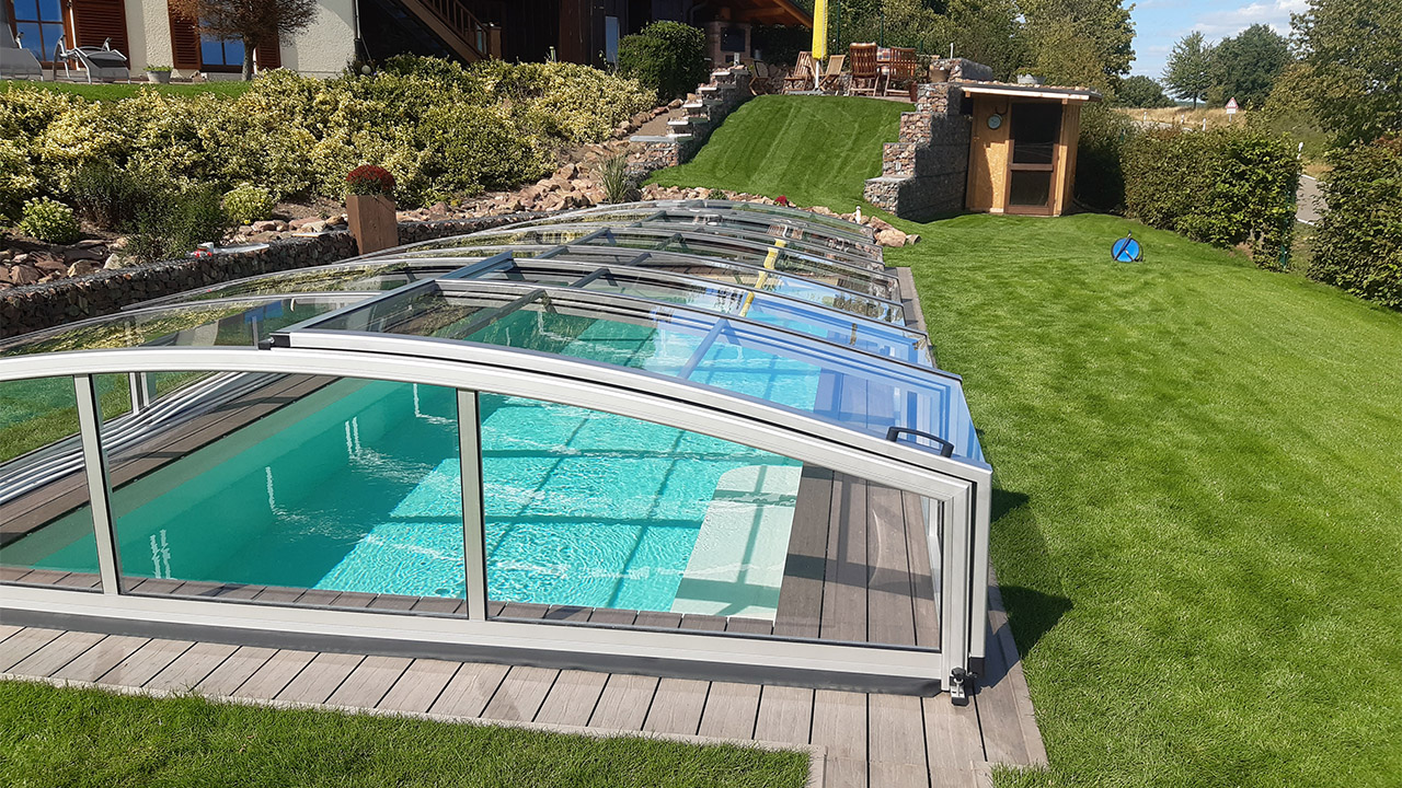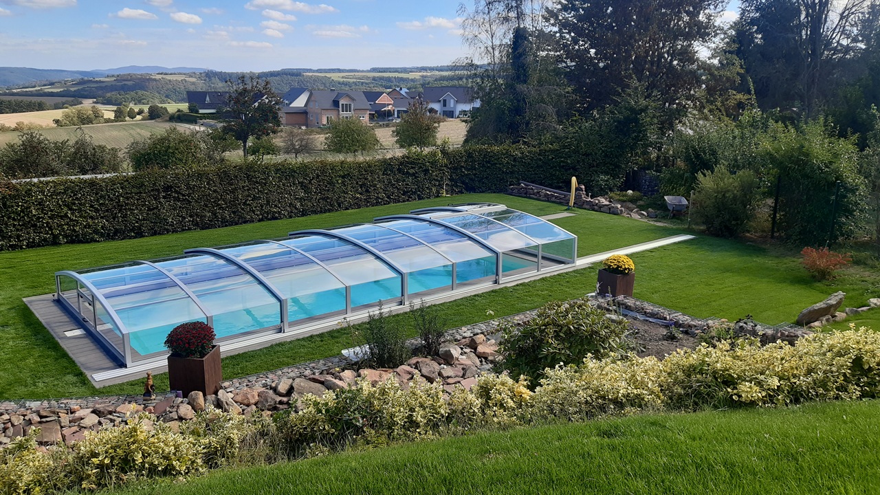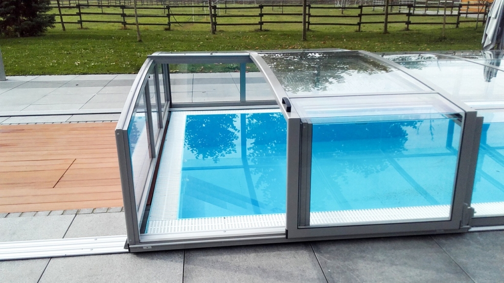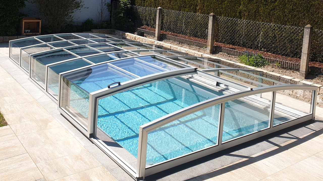 Les profilés compacts et renforcés garantissent plus d’élégance et de stabilité. La finition et le design sont de la plus haute qualité. Les angles transparents, grâce au polycarbonate incassable thermoformé, offrent plus de transparence et d’esthétique. La version avec rail au sol d’un seul côté est disponible en option. Comme pour tous nos modèles, les éléments du toit de la piscine couverte peuvent être emboîtés les uns dans les autres de manière télescopique. Avec une rallonge de rail appropriée, la couverture de piscine peut également être complètement repoussée derrière la piscine.