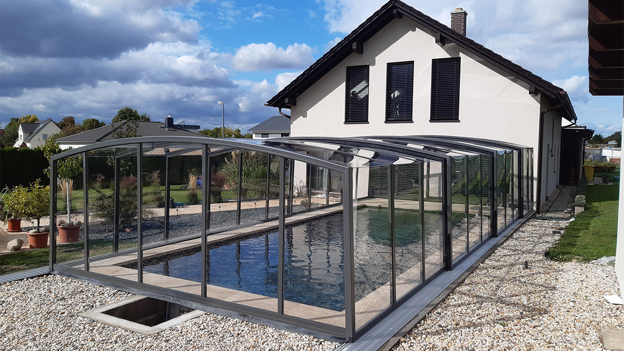 La couverture de piscine offre une protection contre les accidents pour les enfants et les animaux domestiques. Le dispositif de protection contre le vent spécialement développé et les panneaux massifs de haute qualité protègent contre le vent et la neige. Le vitrage en polycarbonate est absolument incassable et résistant aux chocs.