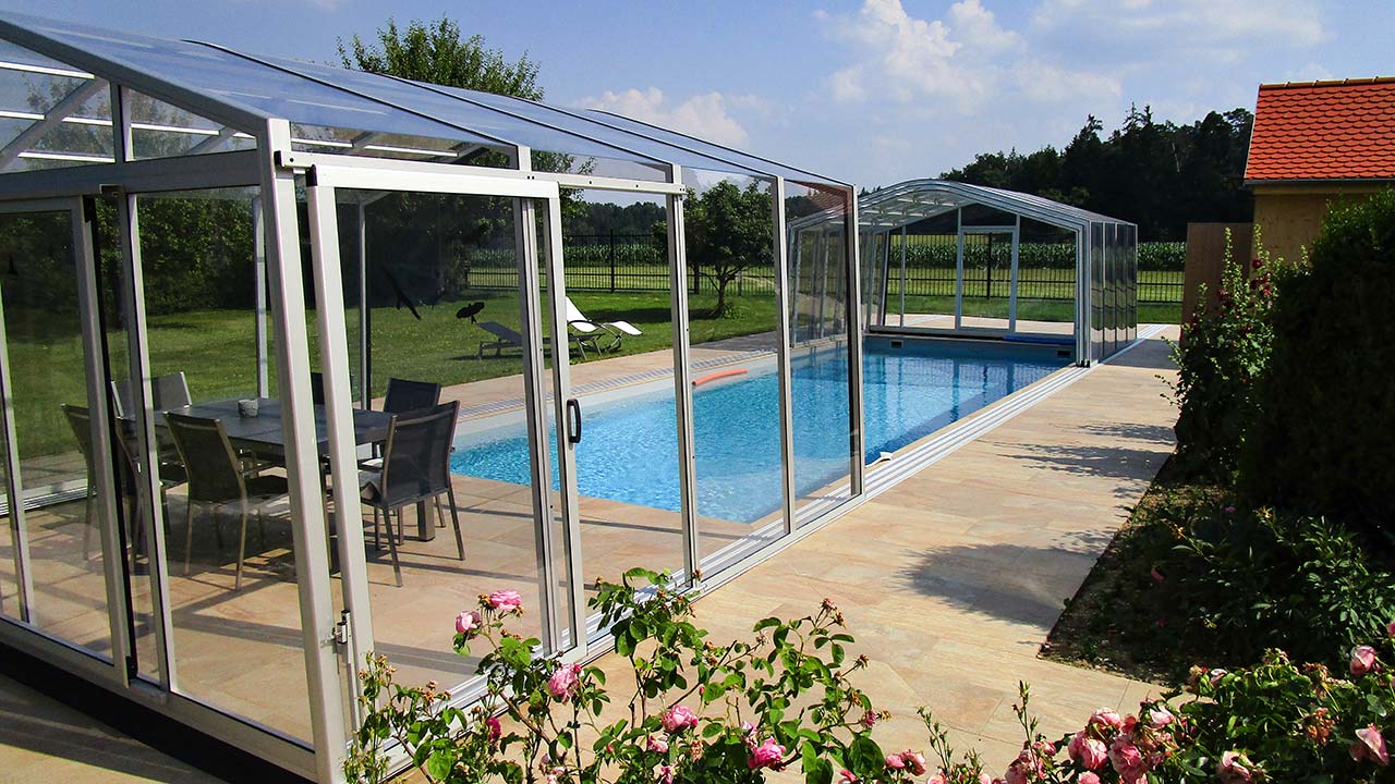 L’intérieur spacieux et modulable de la piscine couverte offre, avec une portée et une longueur appropriées, beaucoup d’espace pour la détente et les jeux, ainsi qu’un vestiaire intégré. La CARAT Nostalgie et le nouvel espace de vie qu’elle crée, avec tous les avantages d’un abri haut de piscine, sont la réponse à la recherche de quelque chose d’exceptionnel. Les surfaces transparentes du toit de la couverture de piscine laissent passer même les rayons les plus faibles du soleil à l’intérieur de la couverture et réchauffent l’espace intérieur ainsi que l’eau de la piscine. La force de CARAT Nostalgie réside dans la technique de pliage thermique en polycarbonate incassable, qui permet d’obtenir des angles transparents et un design léger. CARAT Nostalgie s’intègre ainsi harmonieusement dans son environnement. Nous serons ravis de vous aider à créer votre propre espace de baignade nostalgique.