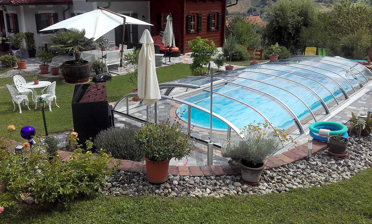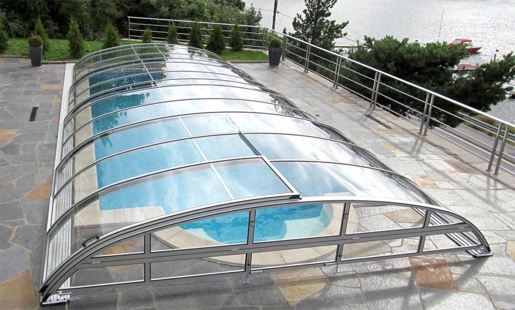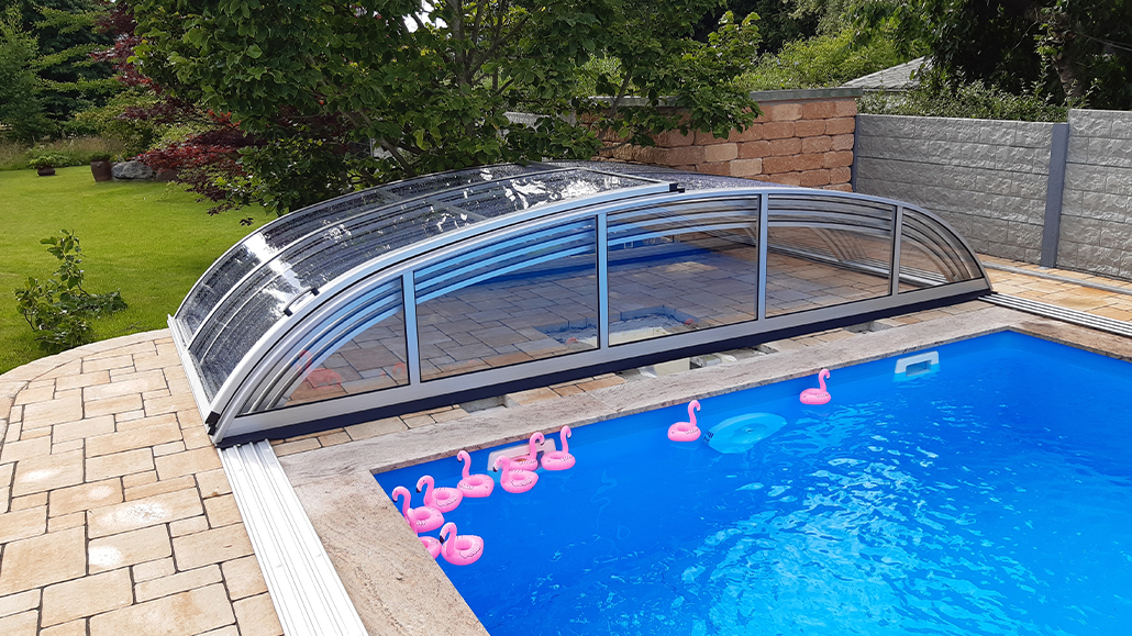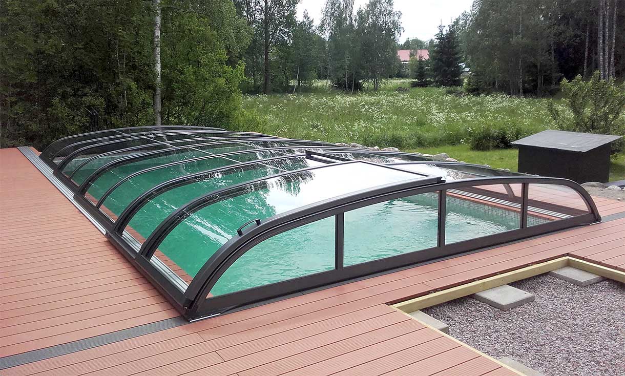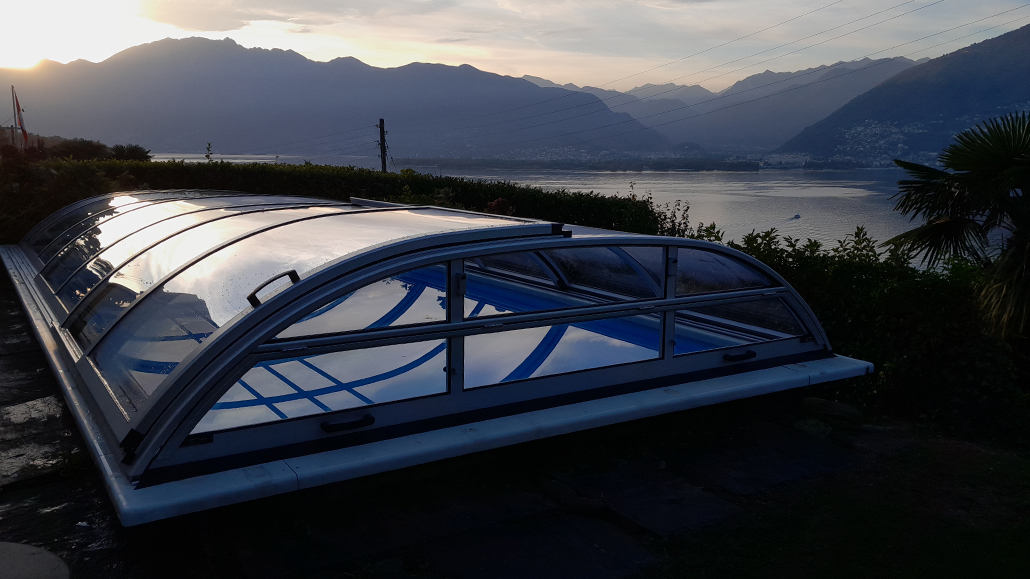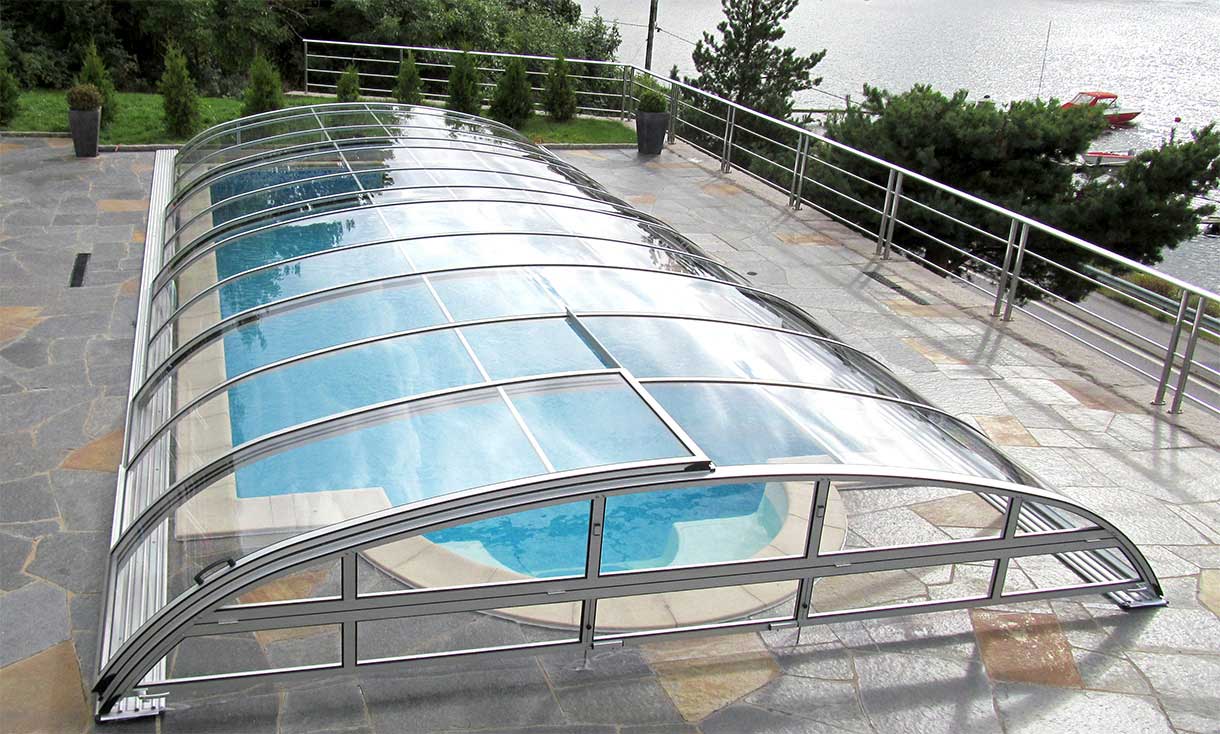 Abri de piscine VISION Modèle plat, élégant et résistant à l’hiver.