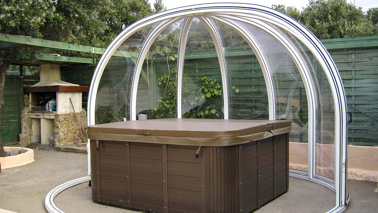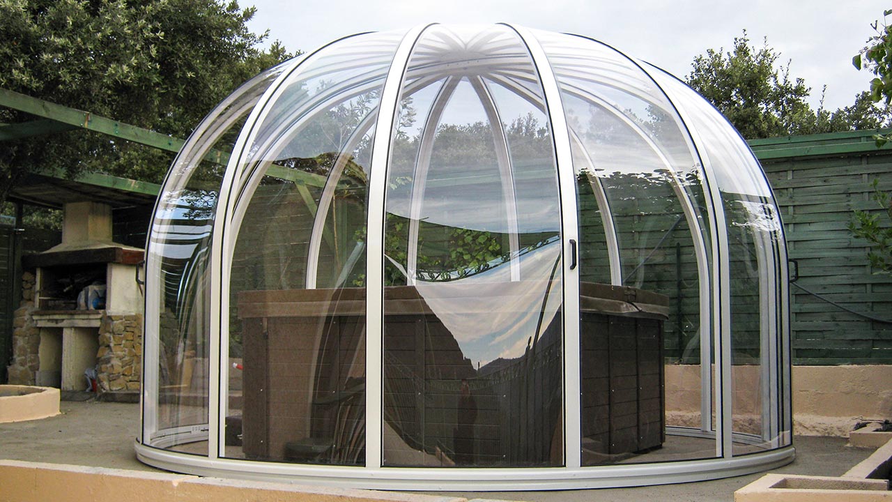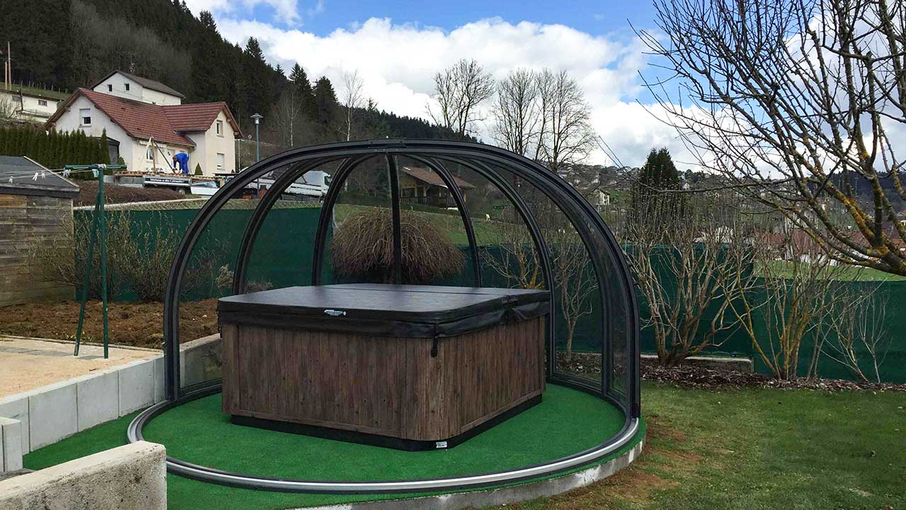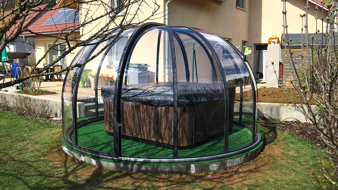 La construction en dôme autoportant de l’abri de spa ROND offre une vue panoramique optimale sur le jardin et les espaces extérieurs.
