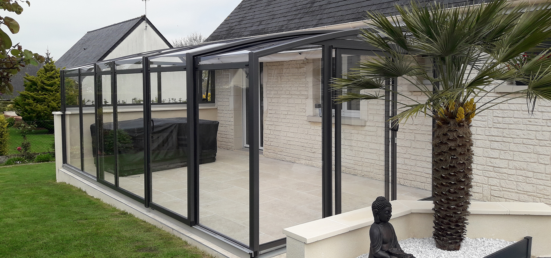 L’abri de terrasse coulissant TOPAZ offre une vue panoramique sur le jardin grâce à sa transparence. Un design moderne rencontre un savoir-faire technique sophistiqué : une face avant droite reliée à un toit cintré par un coin thermoformé.